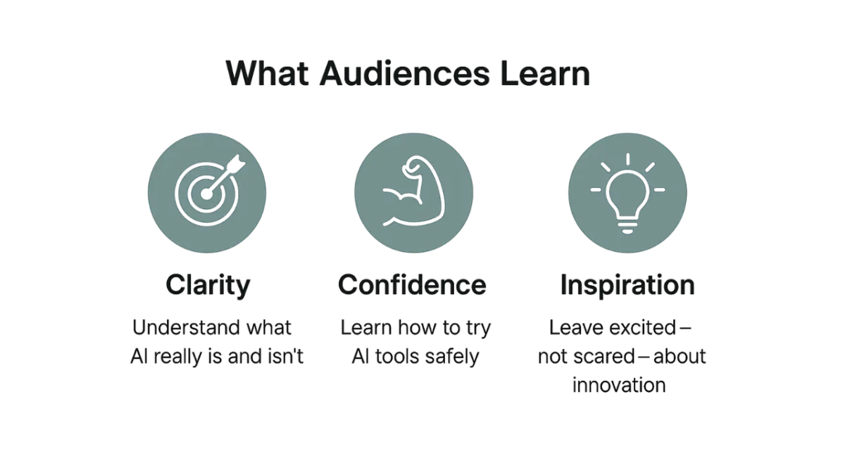 My keynotes focus on people first, technology second. I help audiences understand and humanize AI — turning fear and confusion into clarity, confidence, and action.